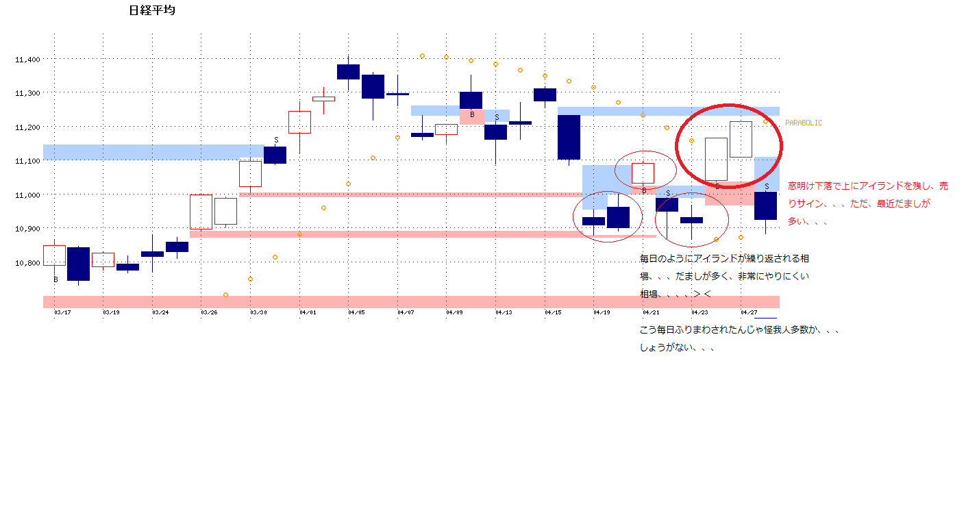 そうなんだよね、節目ぬけといて反転、、、要は騙しがいっぱいで、振り落とされる、、、からあたしも基本、節目ぬけてもあやしいな~って気持ちで見といてる。方向性がでるのはGW後だろうから、それまで無理しないポジでしのぐ^^