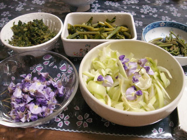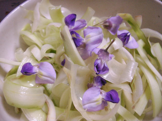 ウドの薄切り一夜漬け(水につけただけ)に藤の花をそえて