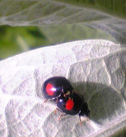 微笑ましいてんとうむしの写真です。でも実はこの下にもう一匹いたのです。さわってびっくり。写真では頭が出ています。恋の戦いは虫の世界も有るようです。