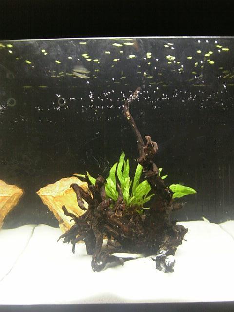 白砂に流木の茶と水草の爽やかな緑のコントラストが良い感じですね。