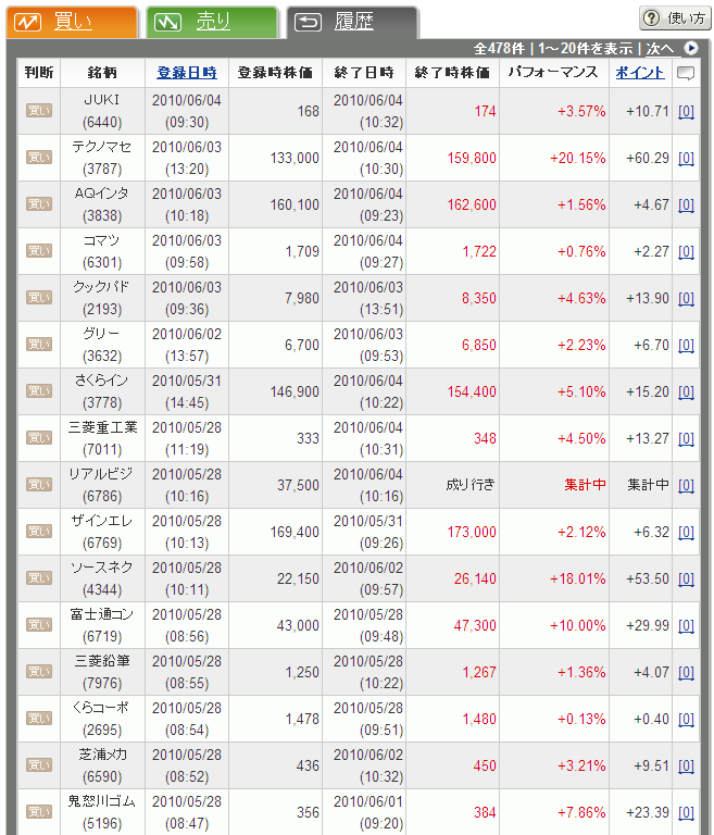 写真2:私の予想履歴の最新日付け順の最初のページです。ヘタですかね?