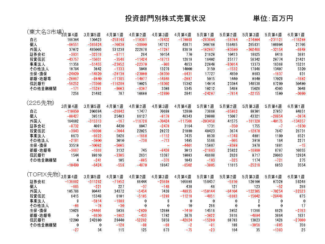 都銀・地銀等は低水準ながら売り越し転換。先物は買い越し継続。