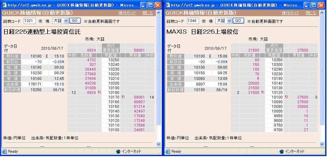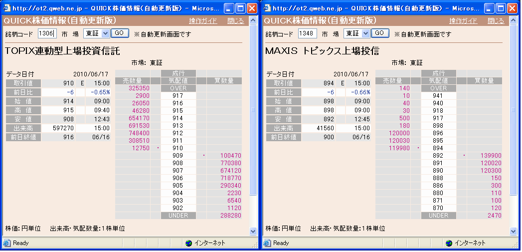 3枚の画像は本日大引けの板の様子である。引けの最良売買気配値とNAVとの乖離率の推移は、以下のWebページを参照のこと: