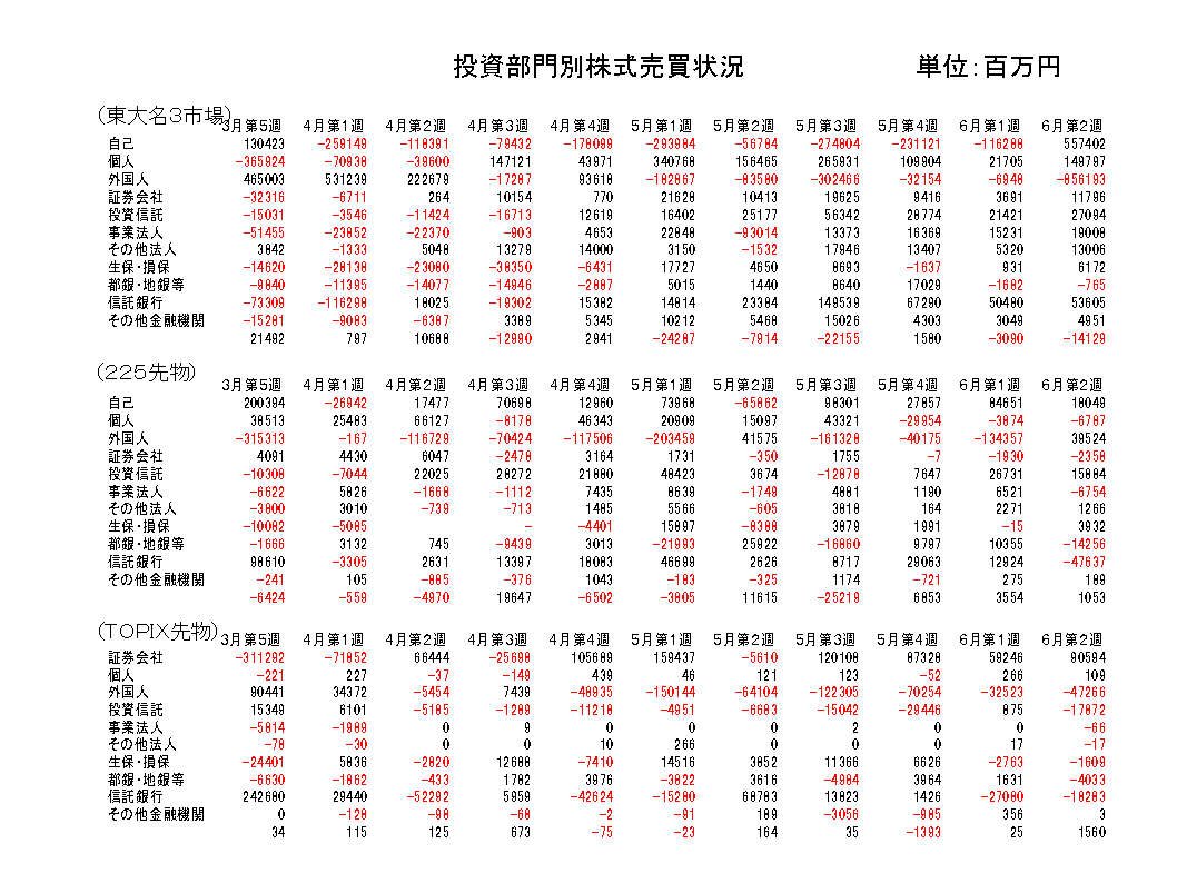 生保・損保は買い越し継続。先物は225買い越し転換。、TOPIX売り越し継続。