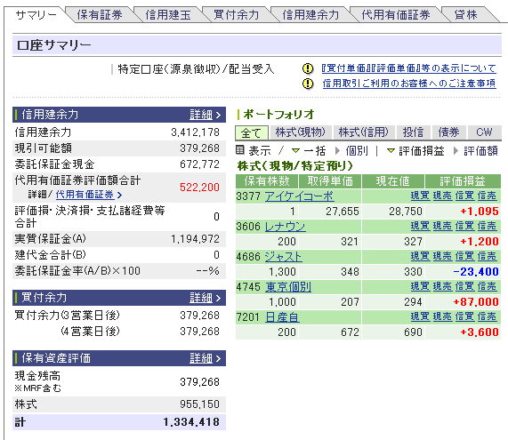 SBI証券の口座管理画面コピー、