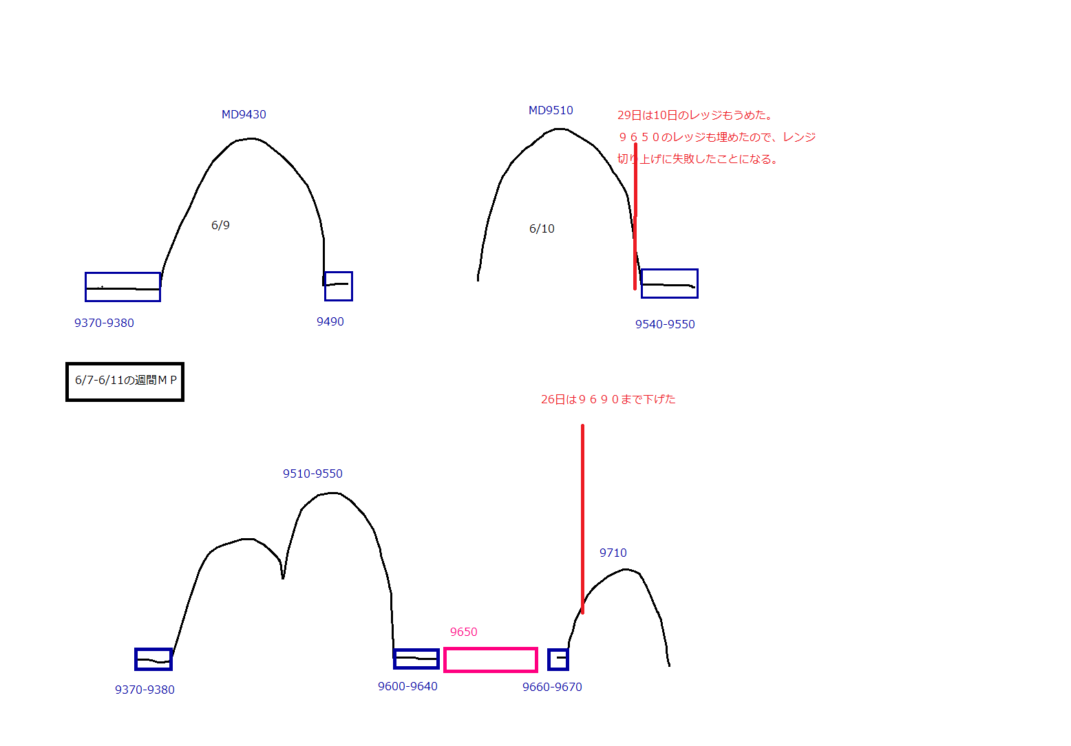 レッジ9650をうめてしまったので、下値は9370までみる必要がある、、、