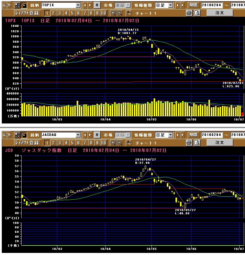 写真1:上段はTOPIXの日足で、下段はJASDAQの日足です