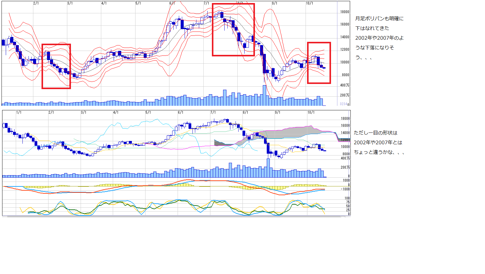 週足一目とボリバンの形状が2007年夏にそっくり、、、しかも月足ボリバンの形状までそっくり、、、 注意