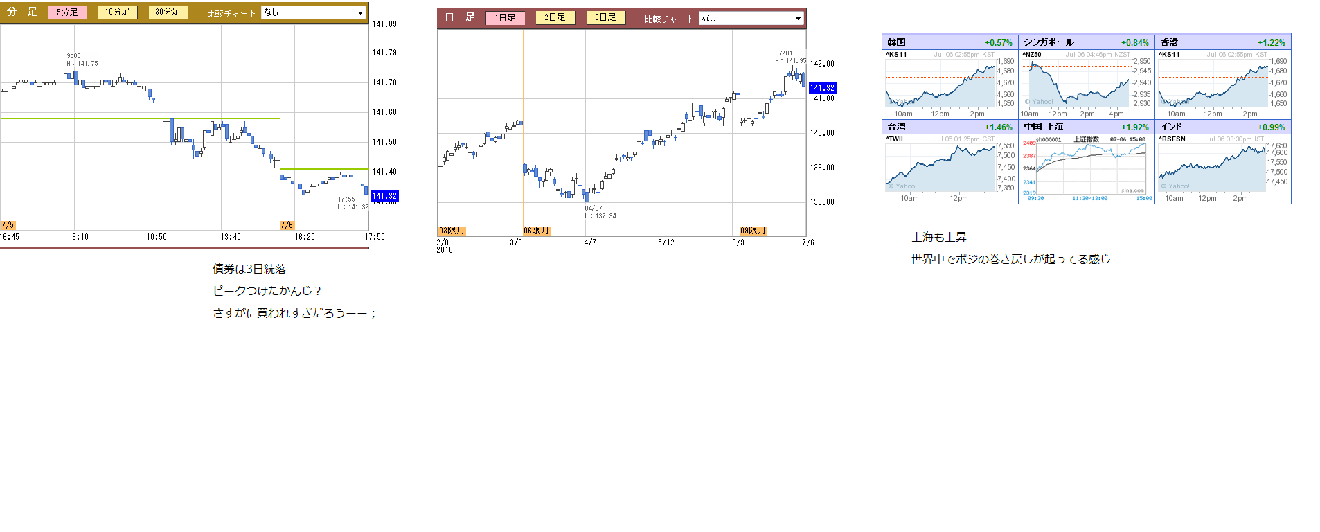 債権は、過去10年の長期国債先物のチャートを見ていれば、資金の逃げ場として限界に近いことが読めたのではないかと思います。出来高推移と併せて指数変動を見ると潮目が変わってきたか?と感じられるところもありましたね。