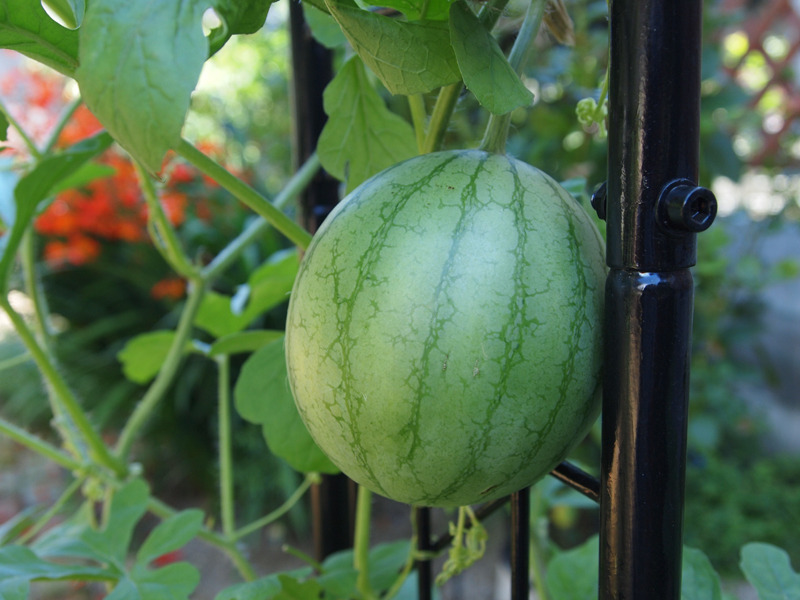小玉スイカを2本植え、昨年は地を這わせたのが