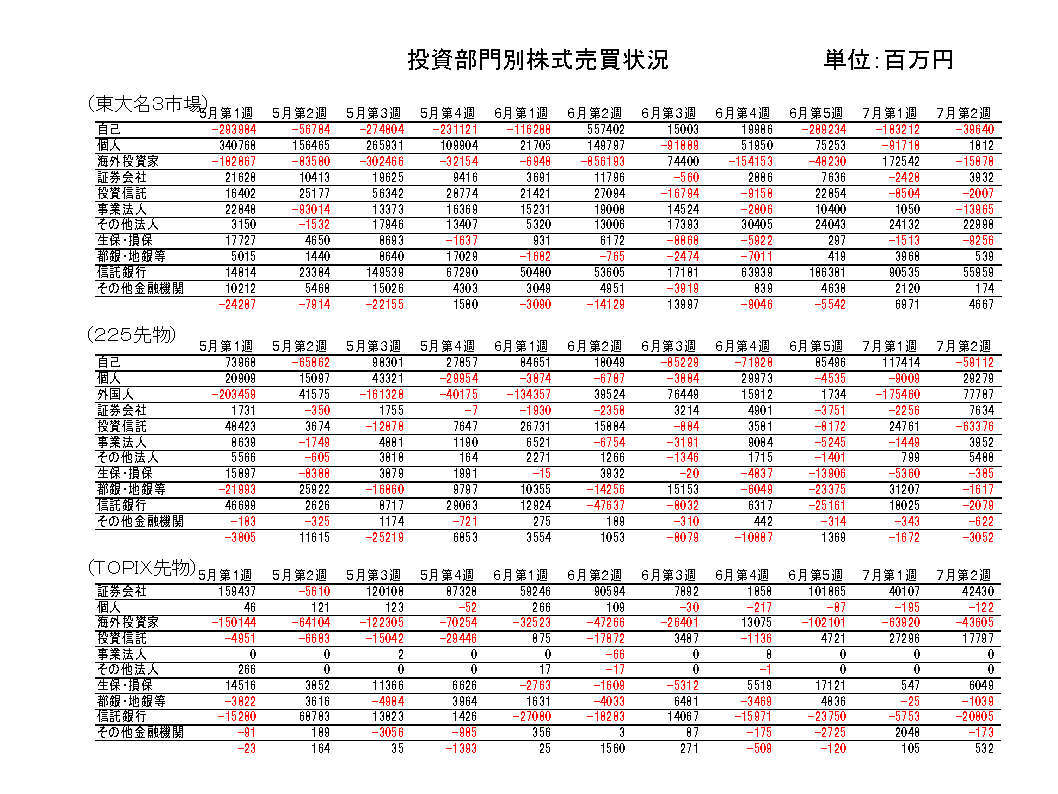 個人は買い越し転換。先物は225買い越し転換、TOPIX売り越し継続。