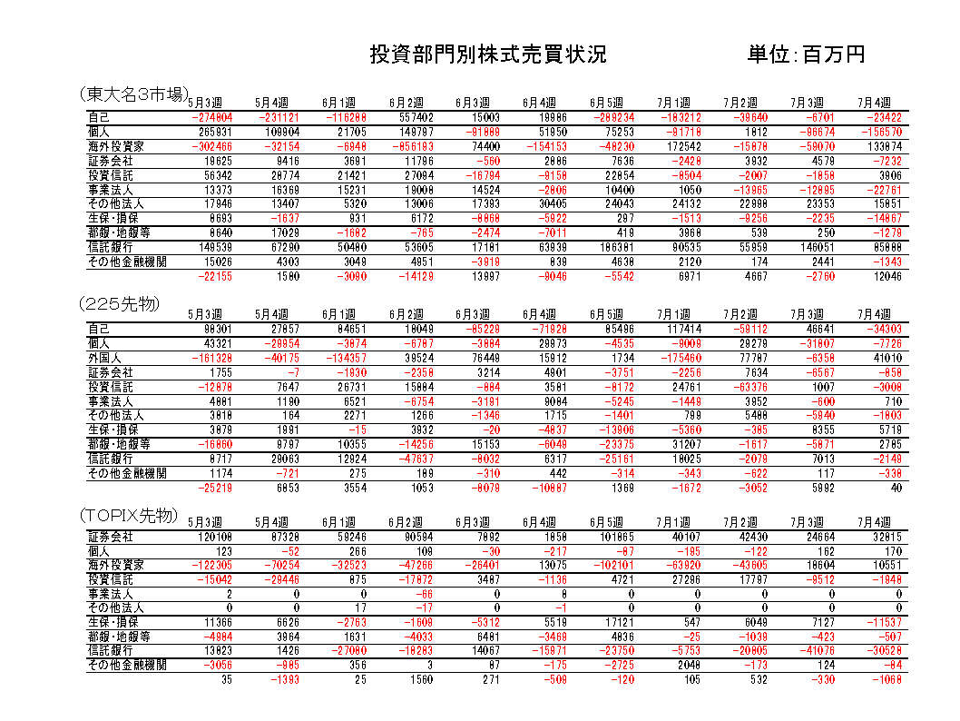 個人は売り越し継続。先物は225売り越し継続、TOPIX買い越し継続。