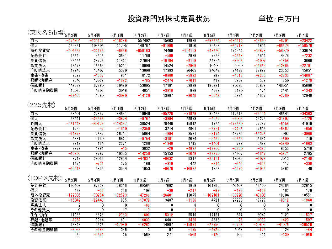 都銀・地銀等は売り越し転換。先物は225買い越し転換、TOPIX売り越し継続。