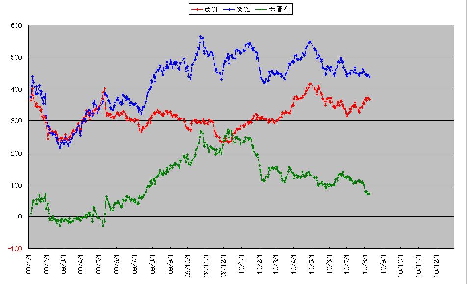 > とうとう8月に入ってから、日立【6501】と東芝【6502】の株価の差が、