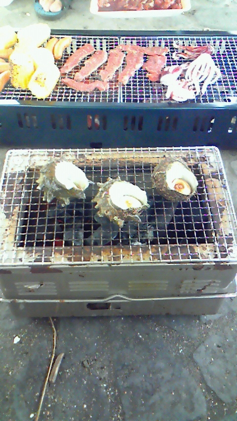 サザエ焼いて、マハグリ焼いて、肉焼いて。