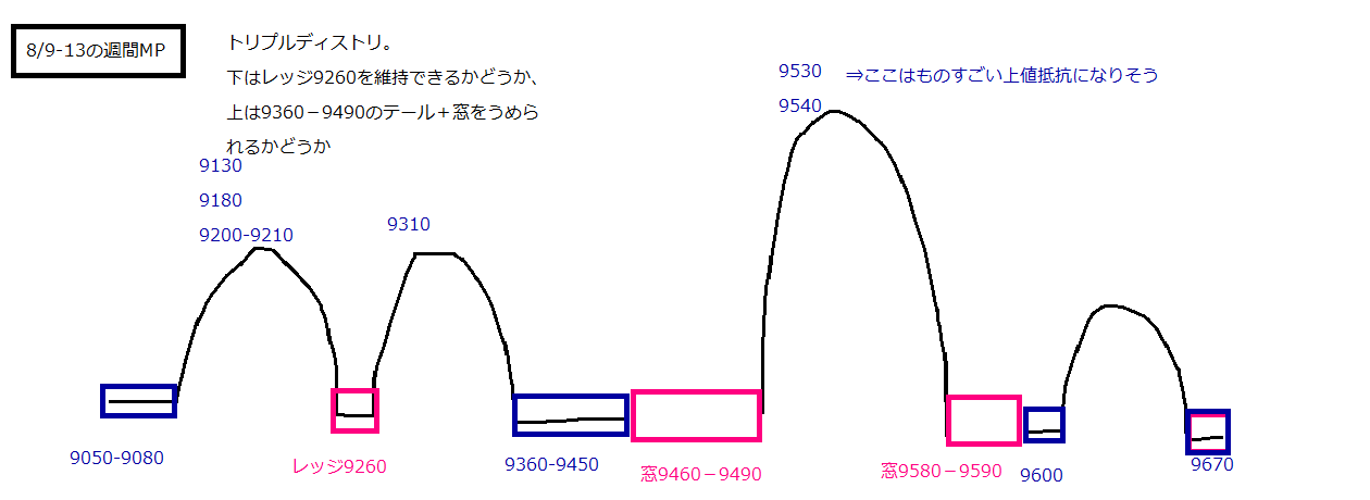 次は9360-9490を全部うめられるかどうか。うめたとしても9530-9540の積みあがり、ここが上値抵抗になりそう。下値不安が消えるのは9530-9540をこえてからかな、、、