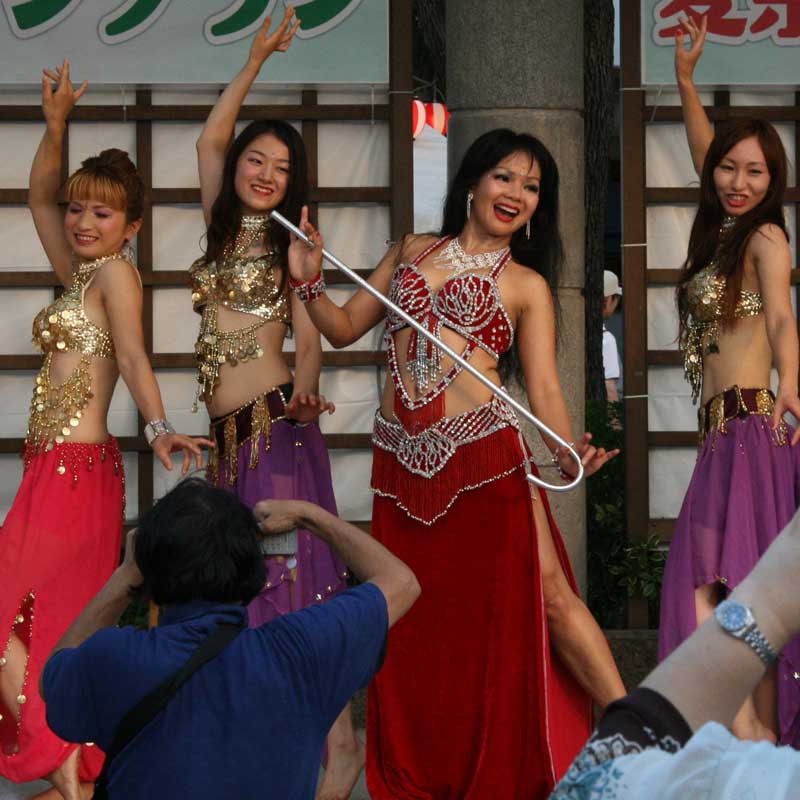 左の写真は、ベリーダンスグループのパフォーマンス。