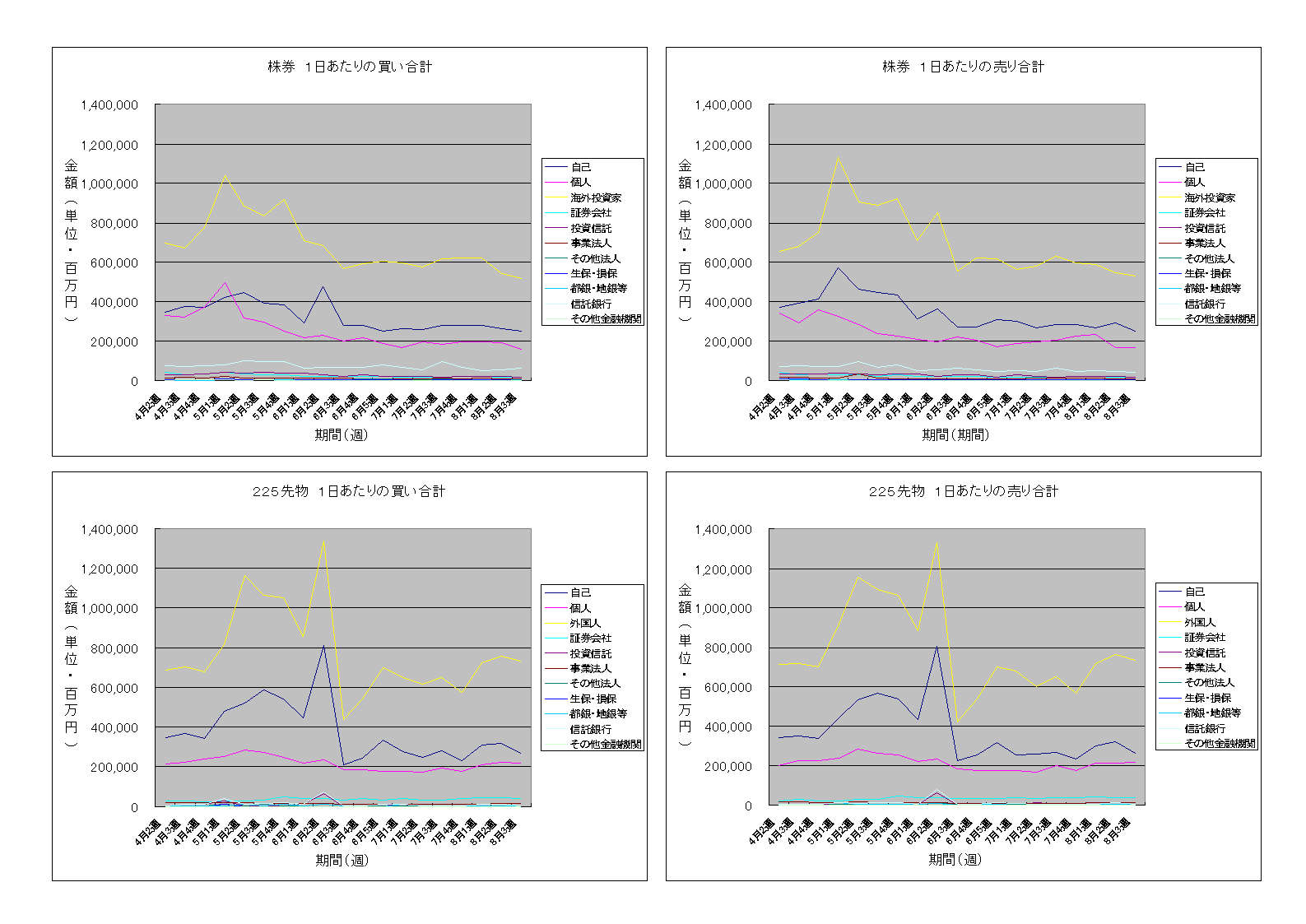 マーケットシェアが小さ過ぎてグラフでは分かりませんが、マーケットの主要なプレーヤーである海外投資家と個人を含め殆どの投資主体が売買を減らしている中で、都銀・地銀等が大きく売買を増やしています。買いにポジを傾けていることですし、官邸から指示が飛んでいる?と見るのは...考え過ぎか(笑)
