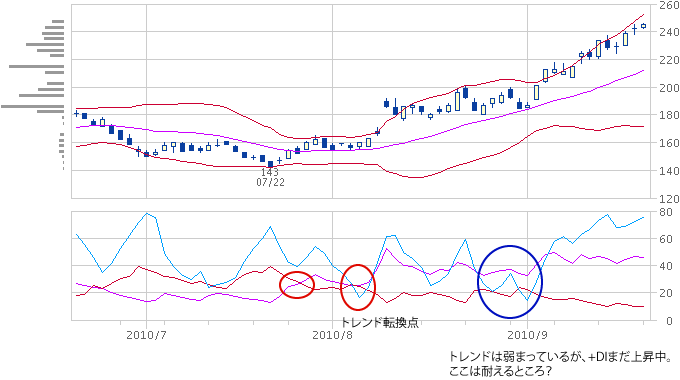 ADXも強く上がりつつ、7月27日にボリンジャーバンド一番上の線に触れ、これを境にADXは下降する。