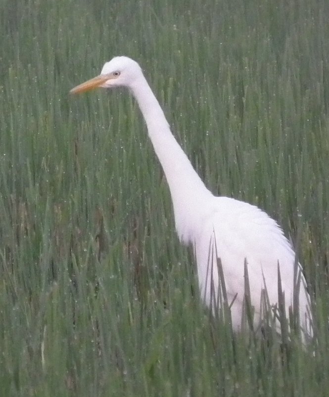 雨の中、シラサギが田んぼでじっと一点を見つめてます