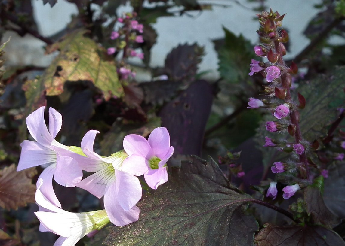 カタバミの愛らしい花の横には赤シソも小さな花を咲かせています