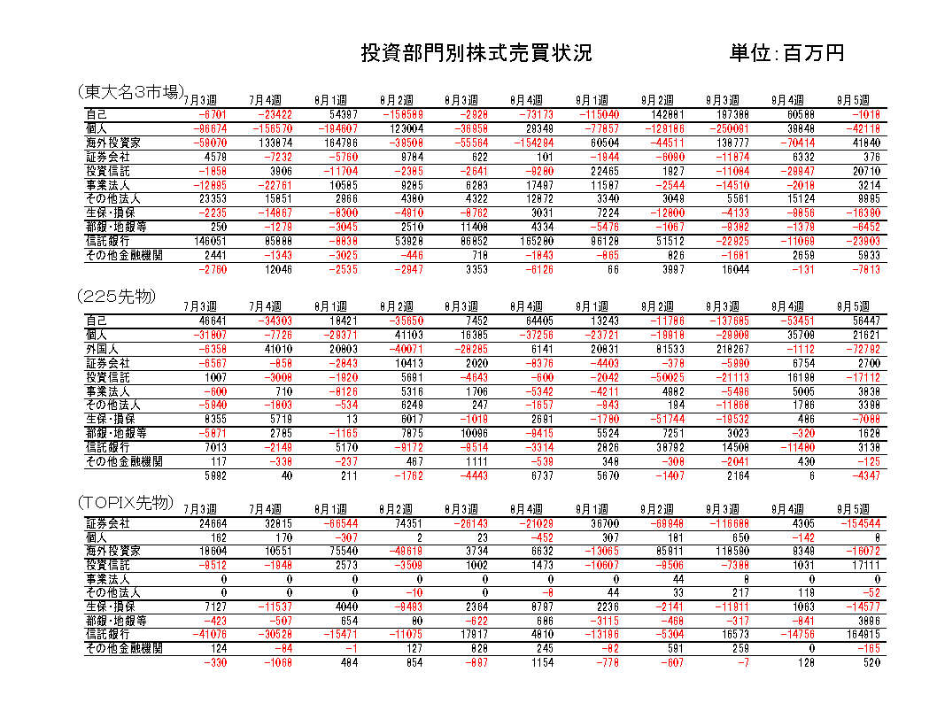 個人は売り越し転換。先物は225買い越し継続、TOPIX買い越し転換。