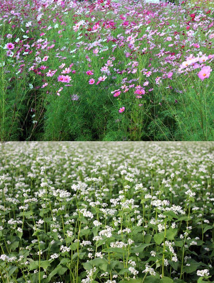 写真1は、田舎の田圃の両サイドのコスモス畑とそば畑