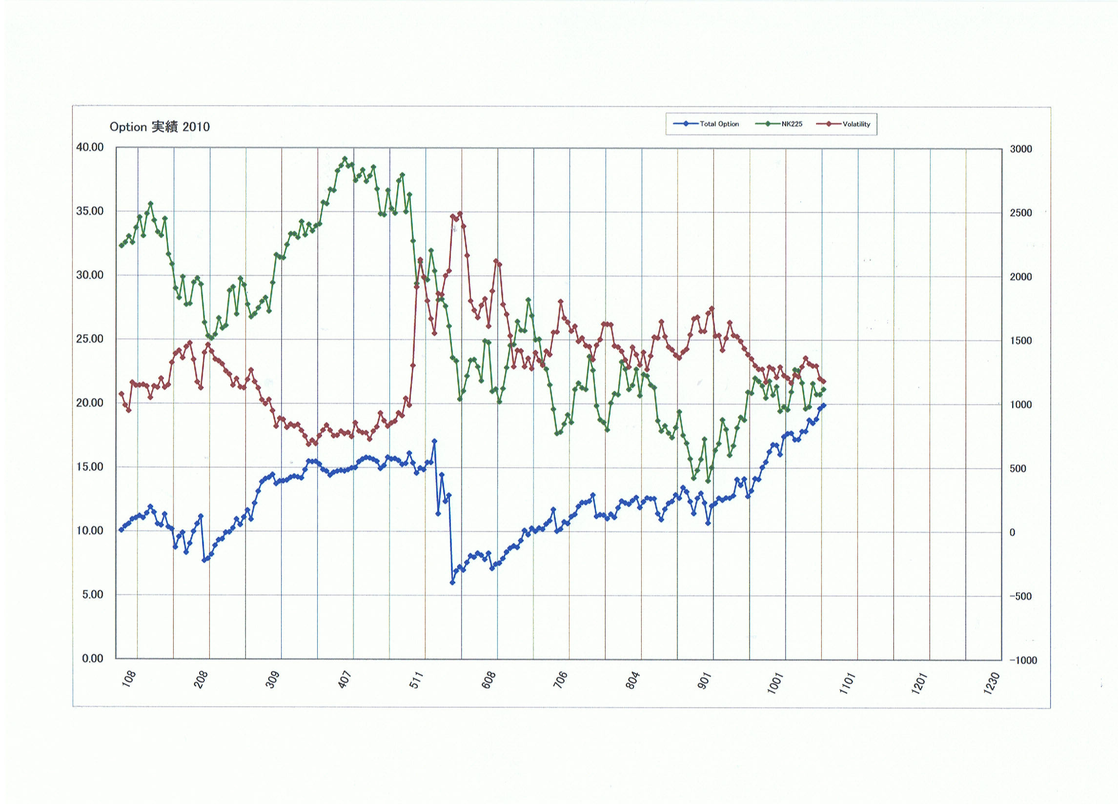 オプションのショート(売り)は基本的に急激な変動に弱く、こんなときは休むか投資額を減らすしてwatch状態にしておくのに限ります。それ以外のときは時間的価値の減少が着実に利益をもたらしてくれます。実績のグラフはある一時期を除けばほぼ右肩あがりのトレンドといえるでしょう。(数値は規格化しています)