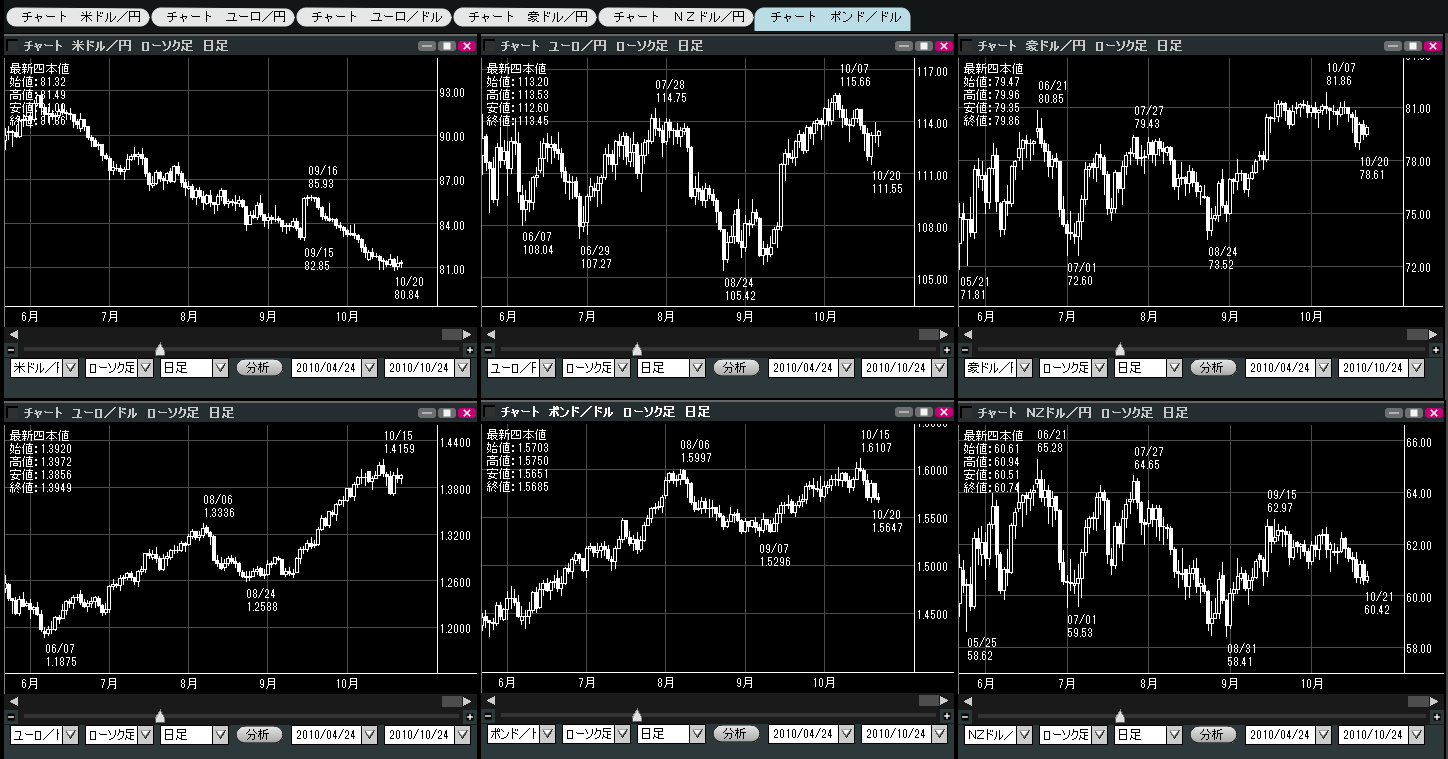 ユロ/円、豪ドル/円、NZドル/円は、ドル/円、ユロ/ドル、ポンド/ドルと違って上下激しい動きだったんですね。今までよく見てなかったので、「へぇー」20って感じです。クロスを見る、とはこういうこと、でいいんですよね?