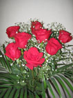 「どの色のバラがよろしいでしょうか?」と聞かれ、「情熱の赤いバラ」と回りを包むように「カスミ草」をお願いした。