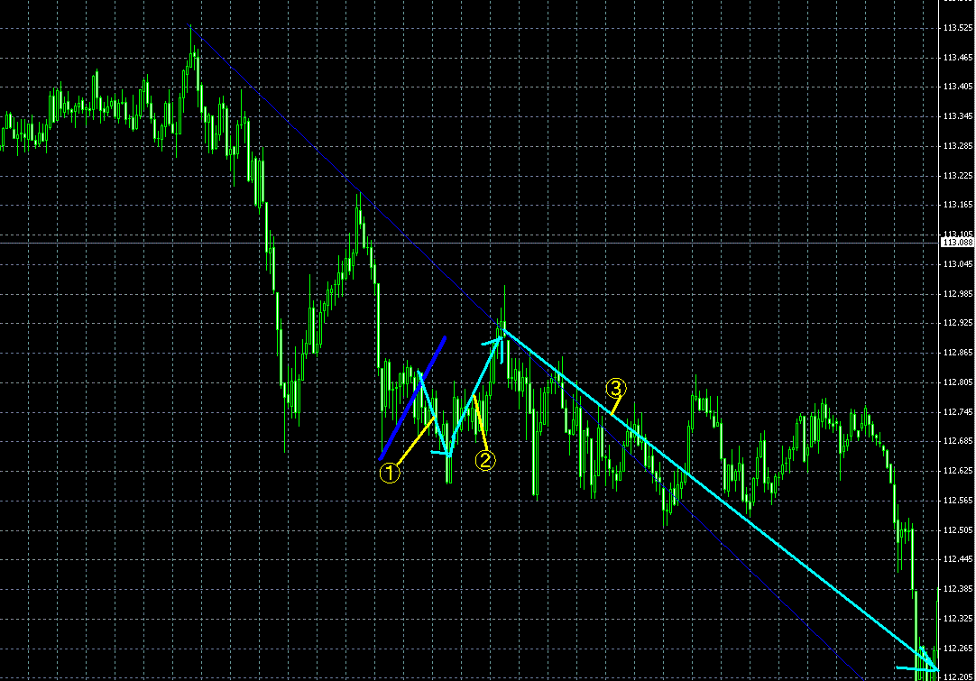 Title :  売りの流れのなかでの、買いの騙しを利用したトレード。トレンドライン+113.00のダブルゼロを組み合わせたトレード。