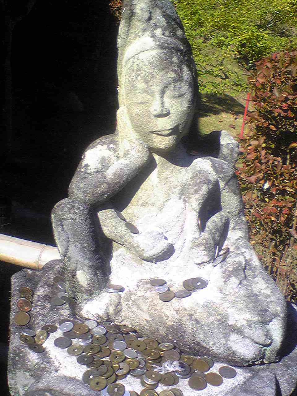 変わったお地蔵さんです。子供をおぶっているかのようです。観光客が多い証か、賽銭がすごい。1円玉が多く、世相が現れます。5円は縁起が良いのでわかりますが。