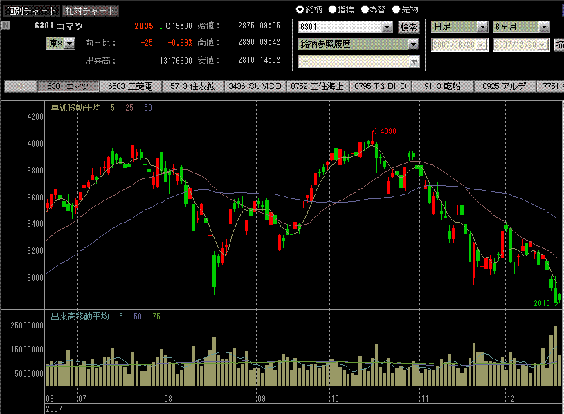 指数は辛うじてプラスでしたが、東証一部値上がり銘柄数は341、値下がり銘柄数は1295と、値下がり銘柄数の方が圧倒的に多かったです。節税対策の売りが出されている感じがしますね。昨日までは、コマツ、三菱電機あたりがきつい下げで、これらは昨日のうちに売り切ったのか、今日は比較的強かったです。今日売られてたのは、SUMCO、住友金属鉱山、乾汽船あたり、あとは新興不動産全般ですかね。業績が良くて今年大きく買われていた時期もあったけど、直近のパフォーマンスは悪い、って銘柄が損出しのために売られている感じがします。1月受け渡しになる来週25日から売りが止めば、節税売りだったってことで。