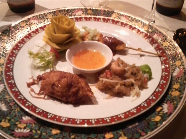 写真中央は前菜盛り合わせ。花は飾りなので省略するとして、右上はマレー系の焼鳥であるサテー。左下は蟹甲羅揚げ、まるで日本の居酒屋メニューのようでござりました。