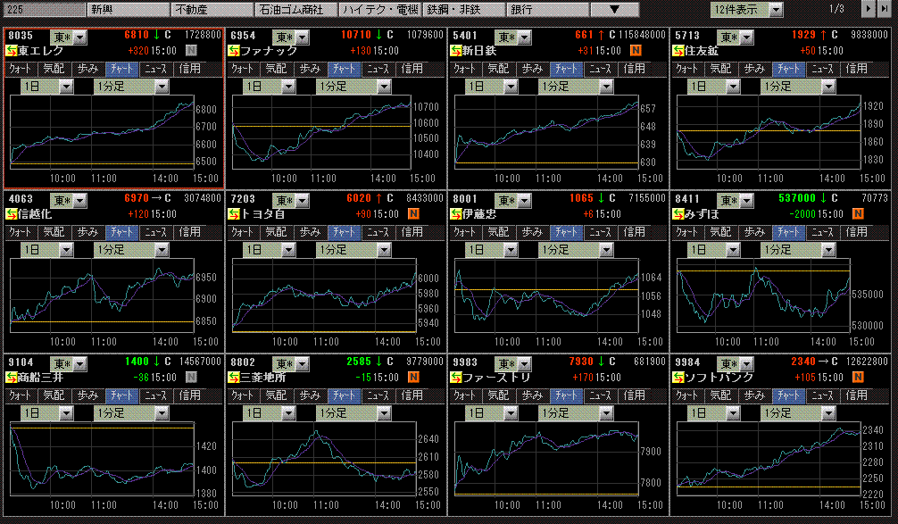 日経平均先物に買いが入り先物主導で上昇しました。強かったのは鉄鋼と値嵩株ですね。他は、先物が買われるからしょうがないから上がるか・・・って感じでもたもたした動きのが多かったです。先物が買われたのは、メリルリンチにシンガポールの政府系投資会社が出資の可能性ってニュースがきっかけですかね。