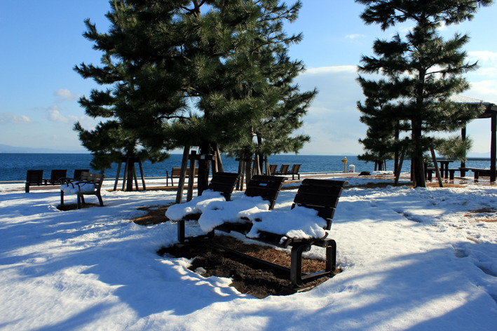 海辺で日も当たってるのにまだまだ雪が残ってます。
