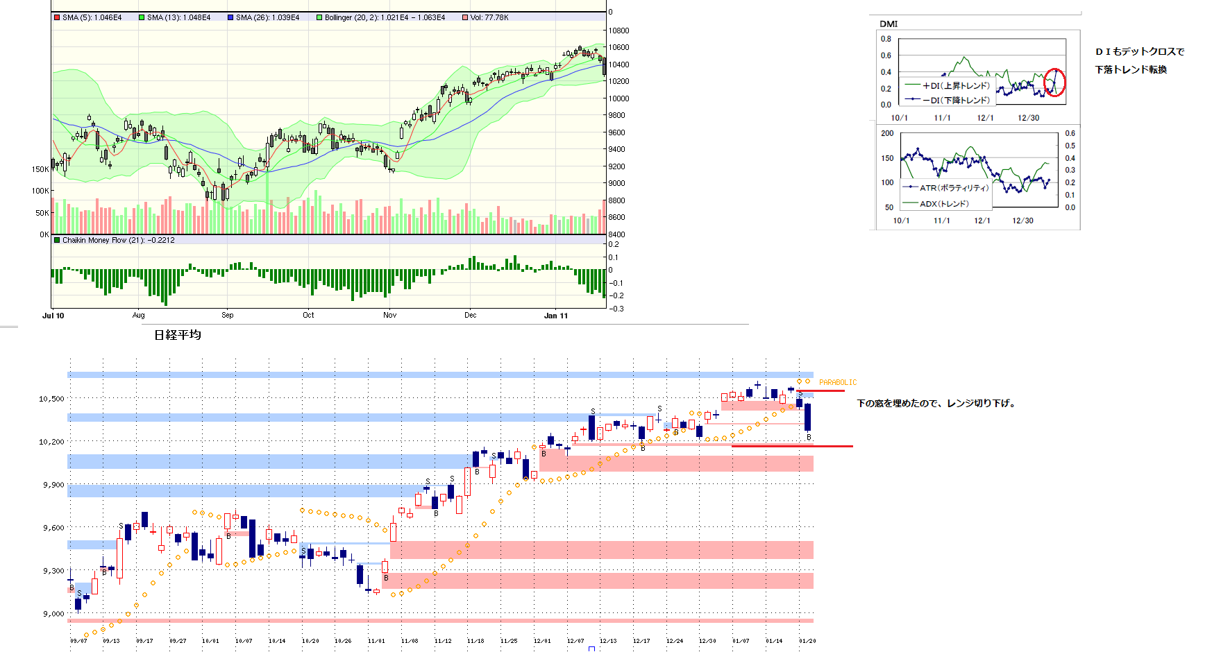 ・今日は、円安で戻ってきたので、いったん↑を試してくるだろう、とおもって、10530に指値売りだしてたのですが、ヒットせず、下げ相場にまったく乗れませんでした><