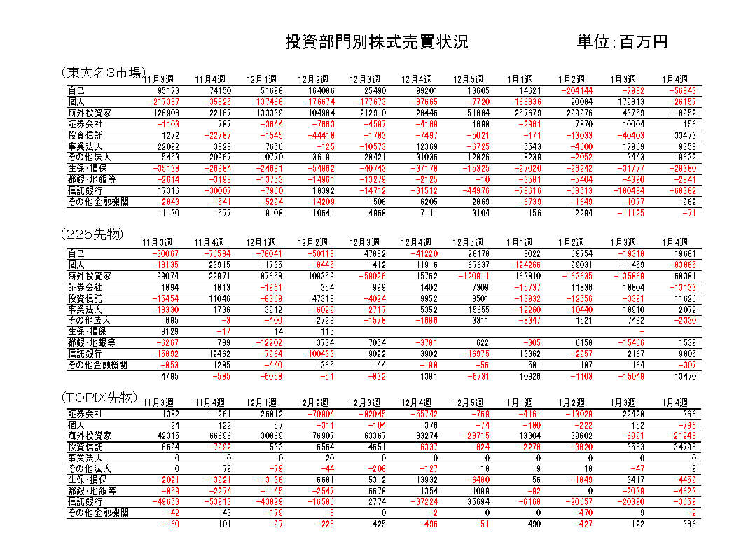 個人は売り越し転換。先物は225売り越し転換、TOPIX売り越し転換。
