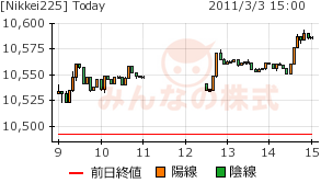 NKは10525円から10900円まで、小幅ながら騰げた。後場の上げは、リビア情勢について好材料視した結果らしい。