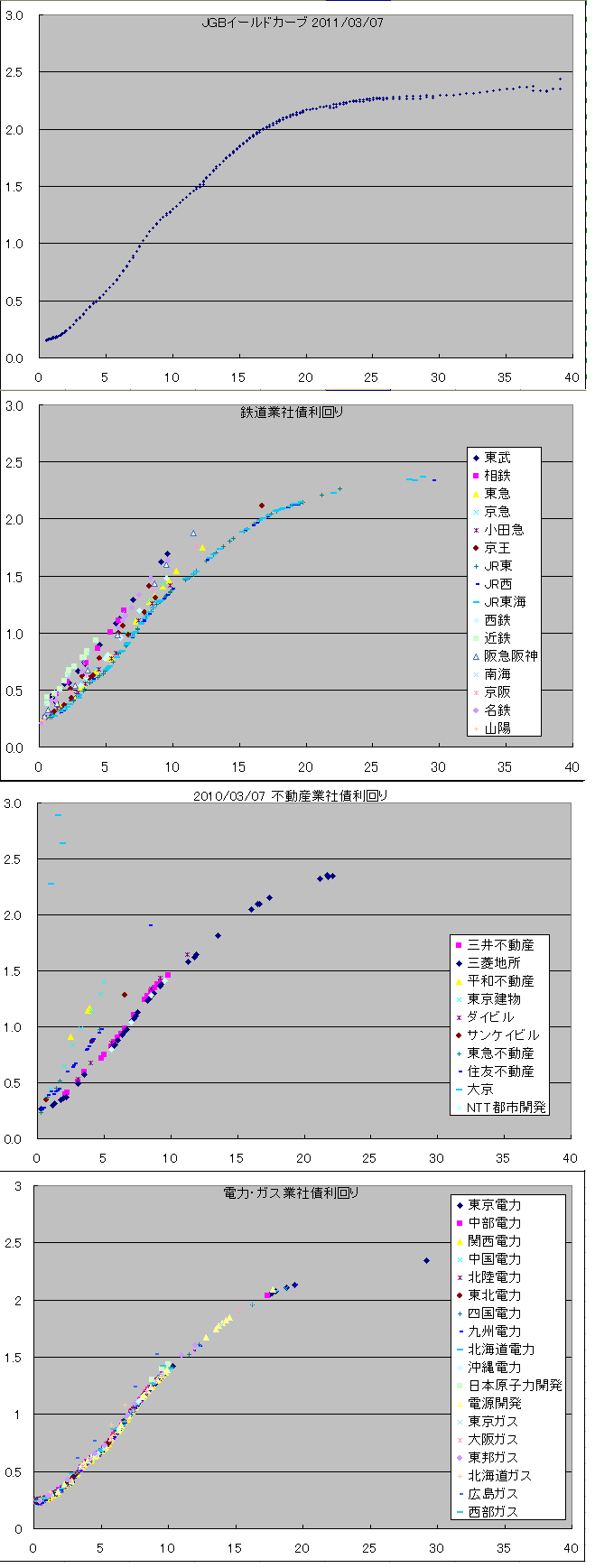 JGB、鉄道業、不動産業、電力ガス業の社債のイールドカーブです。