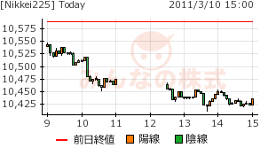 で、原因は、昨日のNYの株価、らしい。他に大きな理由は見あたらないが、持ち合い株の売りが大きかったらしい。で、個人的には、その影響を過小評価したのが、夕べの「小幅騰げ」予想。(いいわけみたいだが、確かに3/4と似た動きで、翌日は下げたのだった・・・・。希望が入りすぎたともいえるかも)