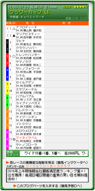 例年の中山では4年連続の3着で連対の無い父ミスプロ系ですが、阪神で行われる事によって上昇が出来ると予想しました。母父サンデーは今の阪神芝1800Mで良く好走していますので好材料です。