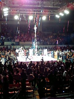 WWEも以前、名古屋大会の予定があったときにチケット予約したら、急きょ中止になったことがありました。ハッスルは、プロレスファンでなくても楽しめるよ!とカミさんも誘ったんですけど、行かないということで、今回は会社の後輩を連れて観戦してきました。カミさんとしては、どうしても、血が飛んで野蛮だと印象が強いようです。