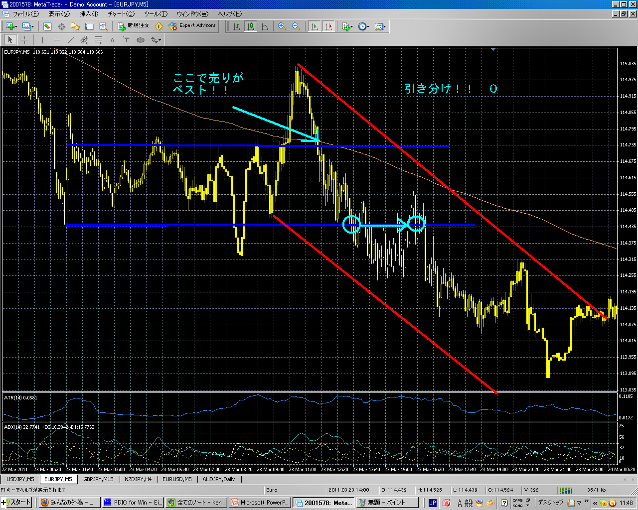 評価できる点は、移動平均線での下では売りというルールをキチンとまもった事。またV字を確認するというチャートポイントを確認したこと。の2点。逆に悪い点は、エントリー遅い。114.74での売りを仕掛けたかった。ここならR&R比が1:2である。流れには乗ったトレードなので60点くらいのトレードか。次回はエントリーポイントを意識してトレードしたい。