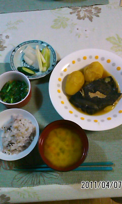 黒がれいの煮付け、ニラの酢味噌あえ、大根とキュウリとセロリのビール漬け、五穀米のご飯、かぼちゃの味噌汁。