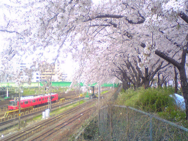 金山総合駅、中央線の上にある桜です。名鉄電車の赤とマッチして綺麗でした。多くの人がシャッターを押していました。