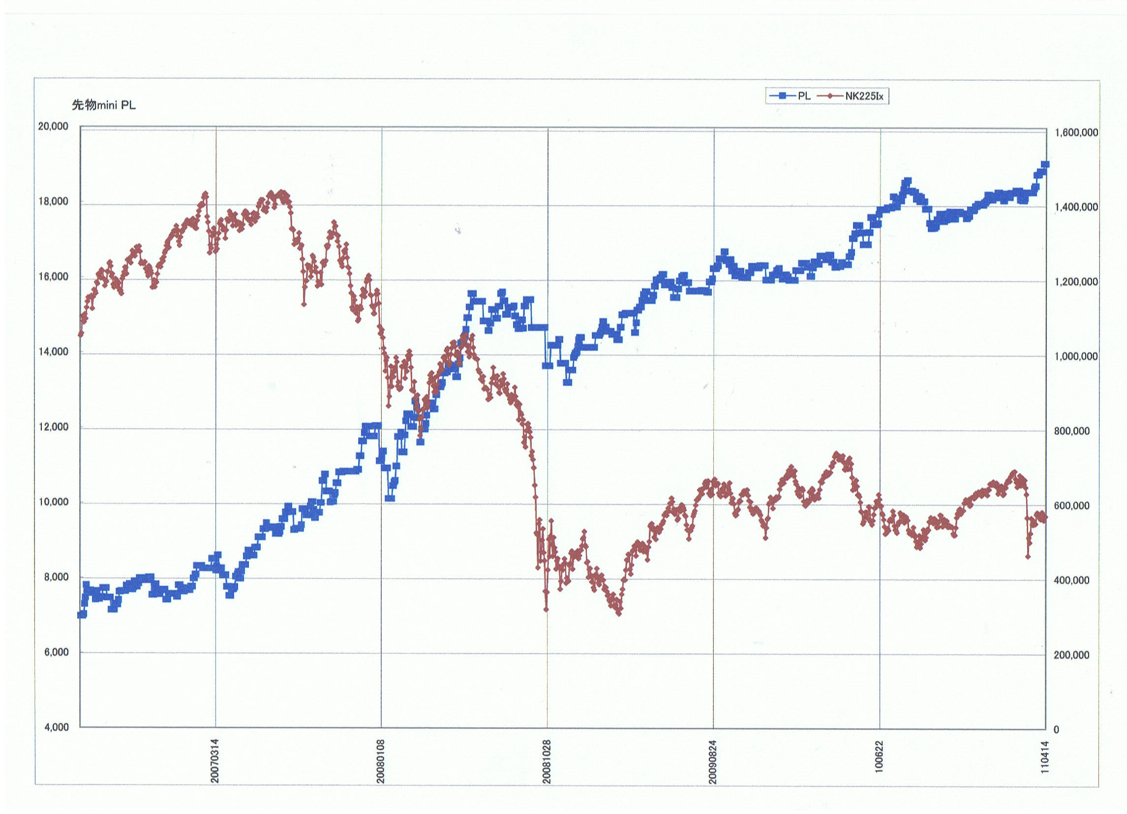 今回は大きな損失を回避する仕組みを追加した。先物miniが始まった2006/7/18から今日まで毎回先物mini 1枚でのトレード成績を表すグラフを添付した。投資対象は先物miniだが先物でもフリーの日経平均ETF(1346)でも活用できる。先物miniの場合1枚分の証拠金(3~10万円)あれば開始できる。最大ドローダウンが25万円くらいあるので30万円くらいの初期資金が望ましい。グラフでは30万円で初めて5年弱で140万円近くになった。大雑把に言って単利で年率100%くらい。ETF(1346)ではレバレッジが低いので成績は落ちるがリスクも減る。このプログラムがなければリーマンショックのときはドローダウンは倍くらい。東日本大震災でも大きく落ち込むが、このプログラムを追加することでリーマンショックは半減、大震災の影響は完全回避できた。(グラフ参照)
