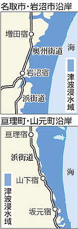 東北大の調査によると津波が奥州街道の手前で止まっている事が判った。