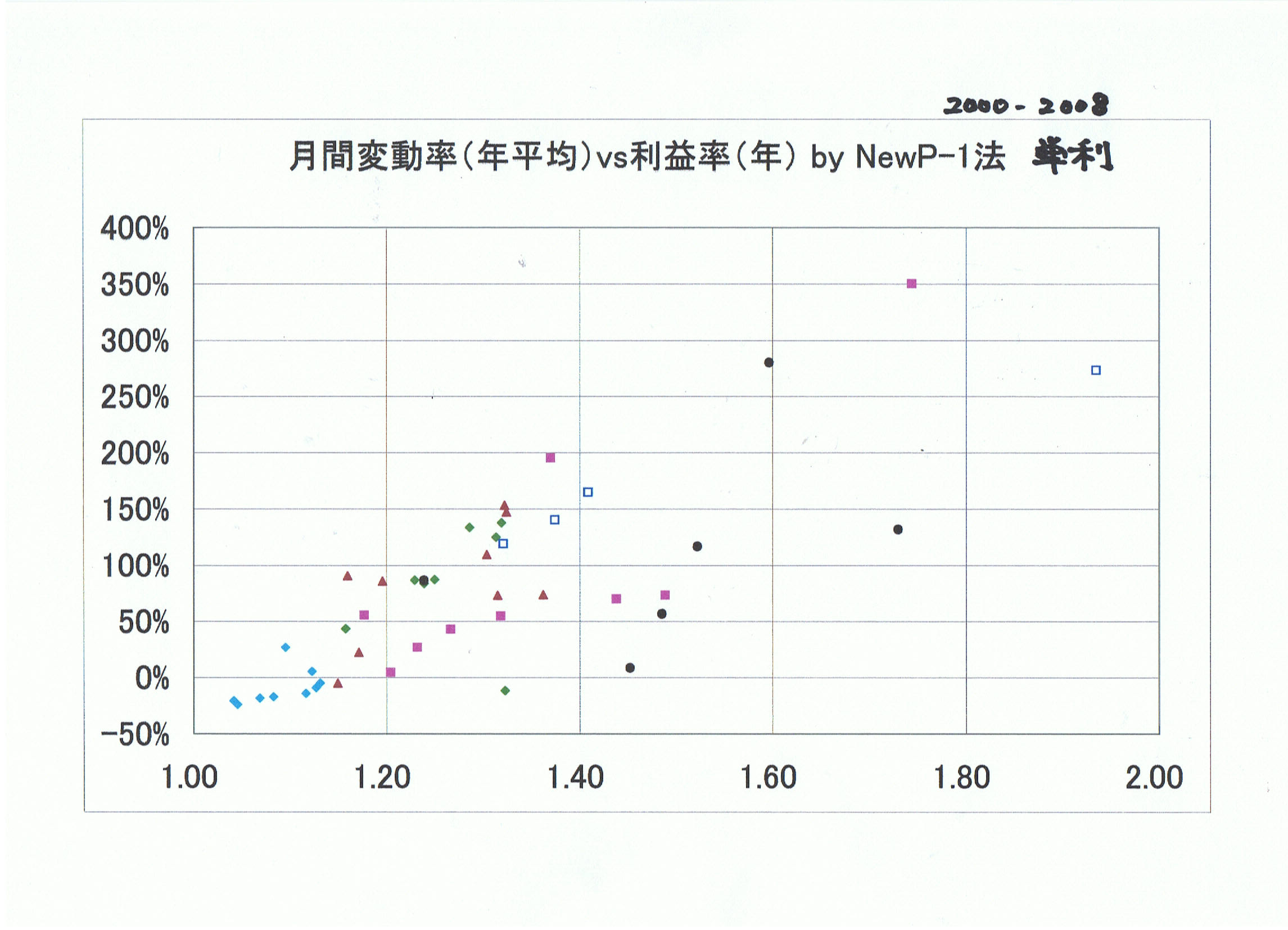 添付の図は2000年から2008年までのシミュレーション結果を示す。横軸は個別の銘柄の1ケ月の変化率(Max/Min)の年ごとの平均値、縦軸はその年の年間利益率を示す。利益率200%は3倍と同じです。運用は信用取引の単利運用。元手を100万円とすると売りも買いも毎回100万円まで。手数料、金利は計算に入ってない。点の色と形が同じものは同じ銘柄のデータである。変化率が大きいほど利益率も上がっているのは明白だが、その分布は大きくプラス側に偏っていることもよく判る。平均変化率が1.20以下でも利益率平均はプラスになっている。左下の水色菱形の点は東京電力である。このような明白に月間変動率が低い銘柄は1日新値法では避けるべきである。余計なことを迷わずに月間変動率が高いと期待できる銘柄を分散してポートフォリオを組み、1日新値法で運用すればそれなりの収益が期待できると確信している。複利運用をすれば回転が効くのでよりよい成果が期待できる。