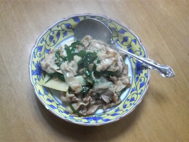 写真は昨晩作った久々の料理写真、「豚バラと山芋のポン酢炒め」でござりまする。